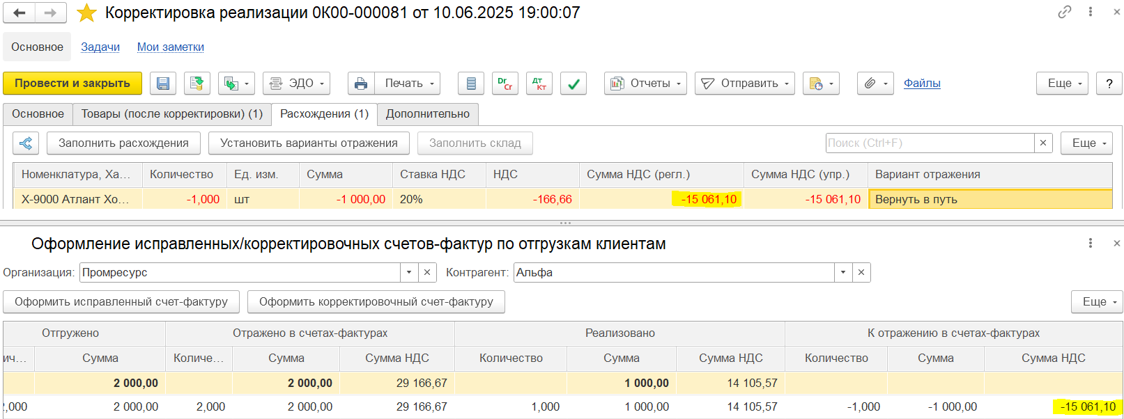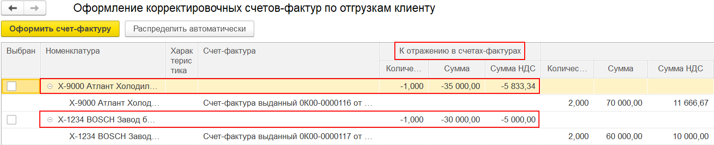 В разделе К отражению в счетах-фактурах формируются данные, которые нужно отразить в корректировочных счетах-фактурах, например, это данные по результату оформления документа списания недостачи отгруженного товара на 1 шт. суммой 35 000 руб. и поступления товара от клиента на 1 шт. суммой 30 000 руб.