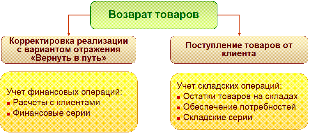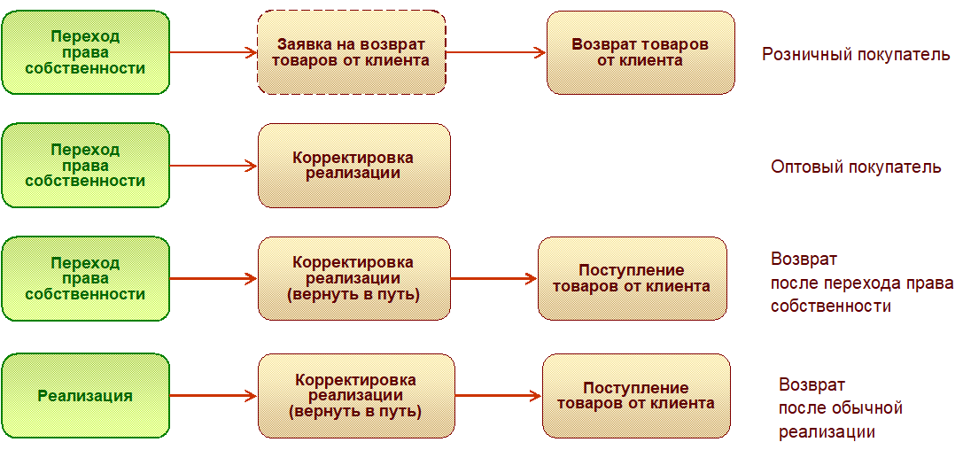 Для оформления возврата товаров «из пути» предназначен документ Поступление товаров от клиента, который можно оформить как до перехода права, так и после перехода права собственности в зависимости от отражаемого сценария: