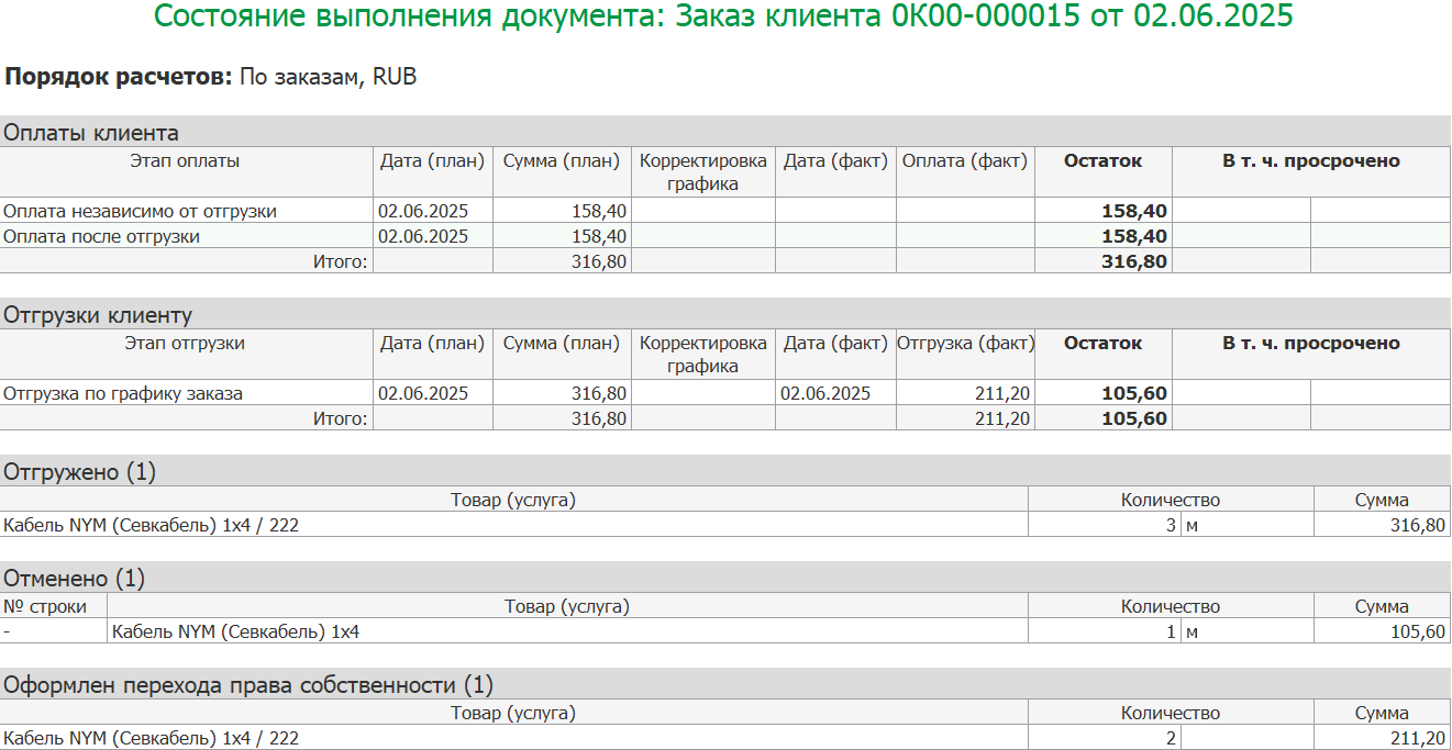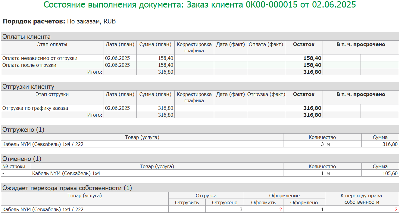 Для заказа добавляется новое текущее состояние Ожидается оформление перехода права собственности, которое предусмотрено только при отгрузке с отложенным переходом права собственности. После оформления документа Отгрузка товаров клиенту заказ переходит в данное состояние.