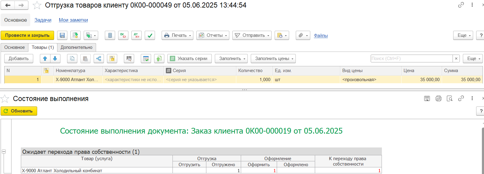 Заказ с операцией Реализация предусмотрен как при обычной отгрузке, так и при отгрузке с отложенным переходом права собственности.