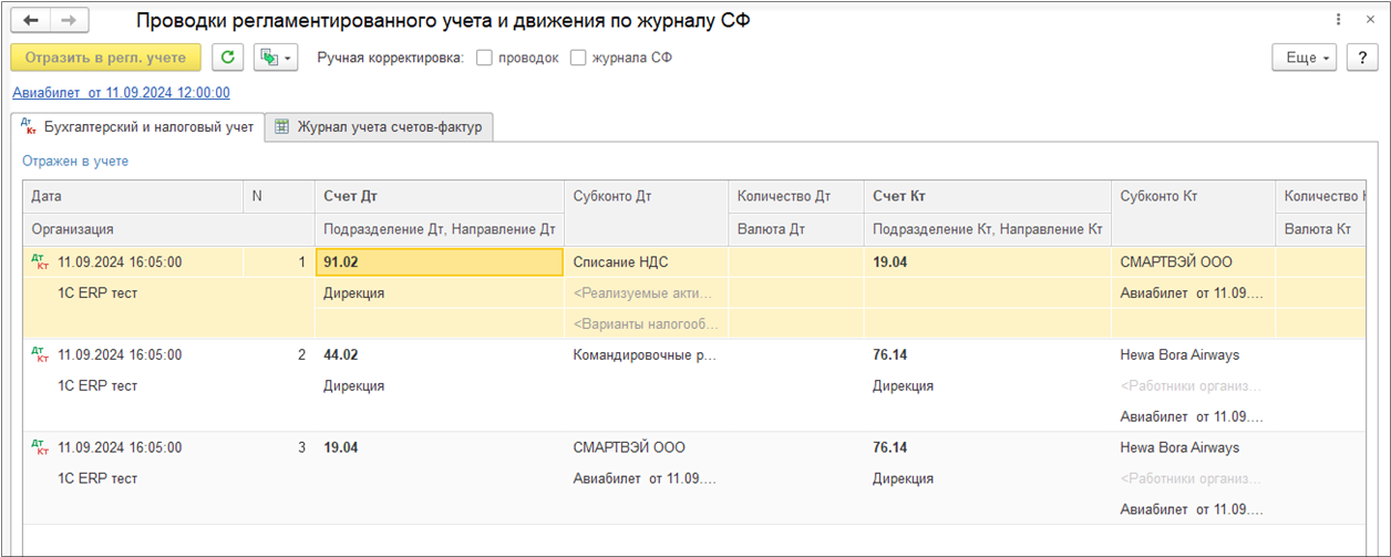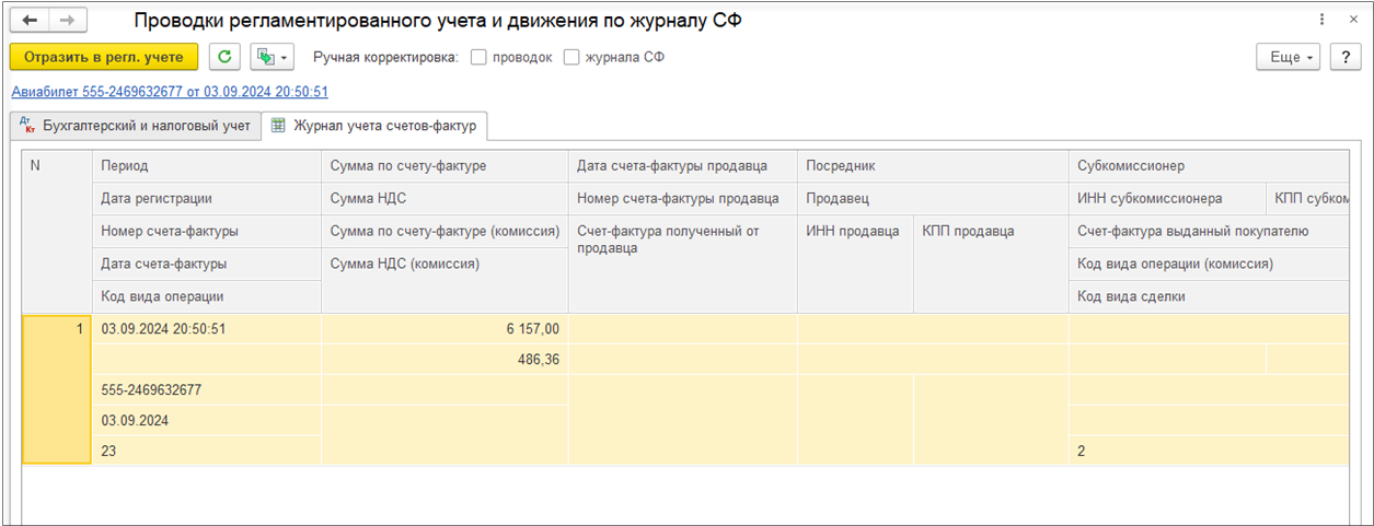 ИСФ при проведении формирует движения по сумме НДС: Сторно «неправильных» движений в «Книге продаж», «правильные» движения в «Книге продаж».