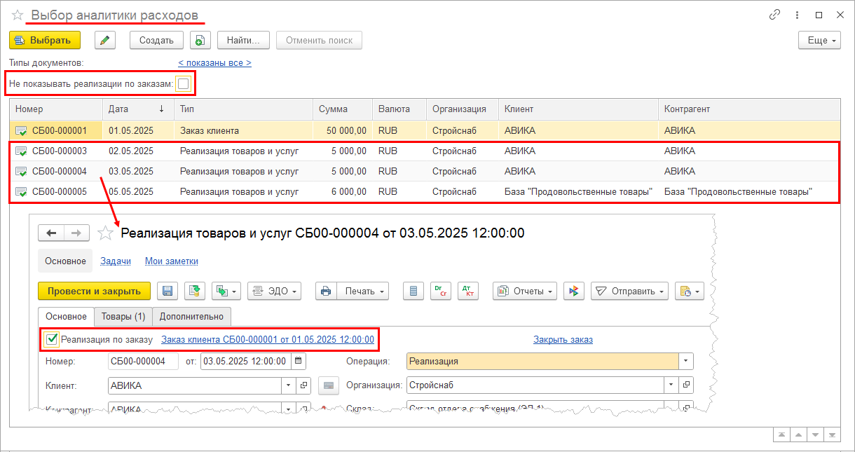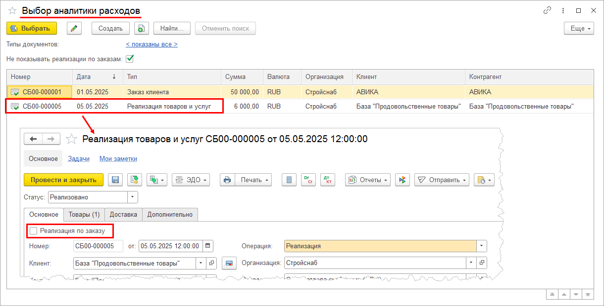 На основании одного заказа клиента с операцией Реализация могут быть введены разные виды документов: