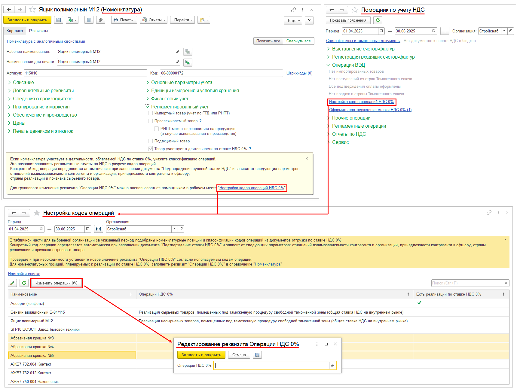 В регламентную операцию Формирование движений по НДС процедуры Закрытие месяца добавлены алгоритмы разделения вычетов НДС по кодам операций реализации со ставкой НДС 0% для заполнения декларации по НДС.