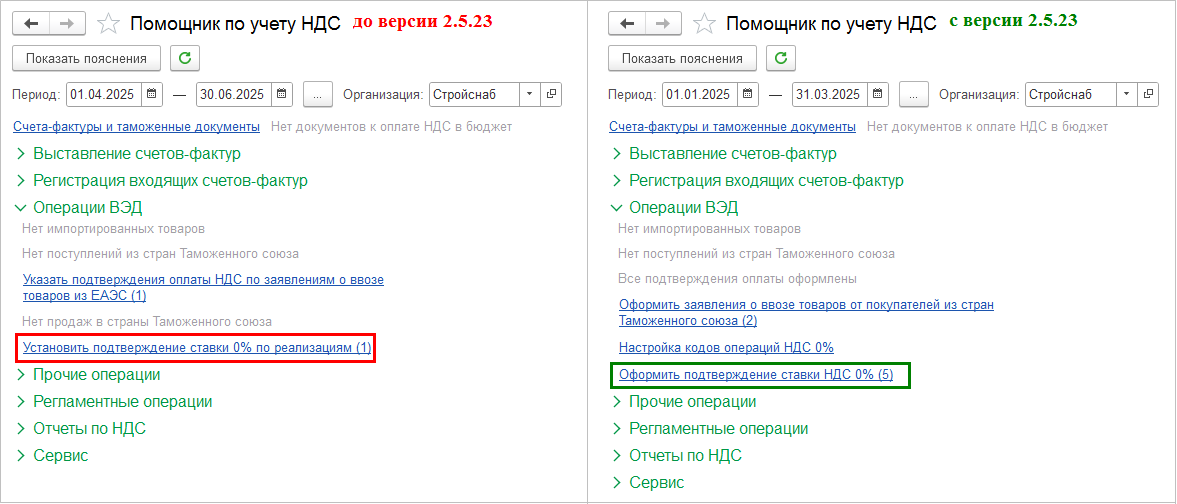 В рабочем месте Помощник по учету НДС гиперссылка Установить подтверждение ставки НДС 0% по реализациям переименована в Оформить подтверждение ставки НДС 0%. Гиперссылка доступна, если есть записи в регистре сведений НДС состояние реализации 0% с состоянием Ожидается подтверждение 0%.