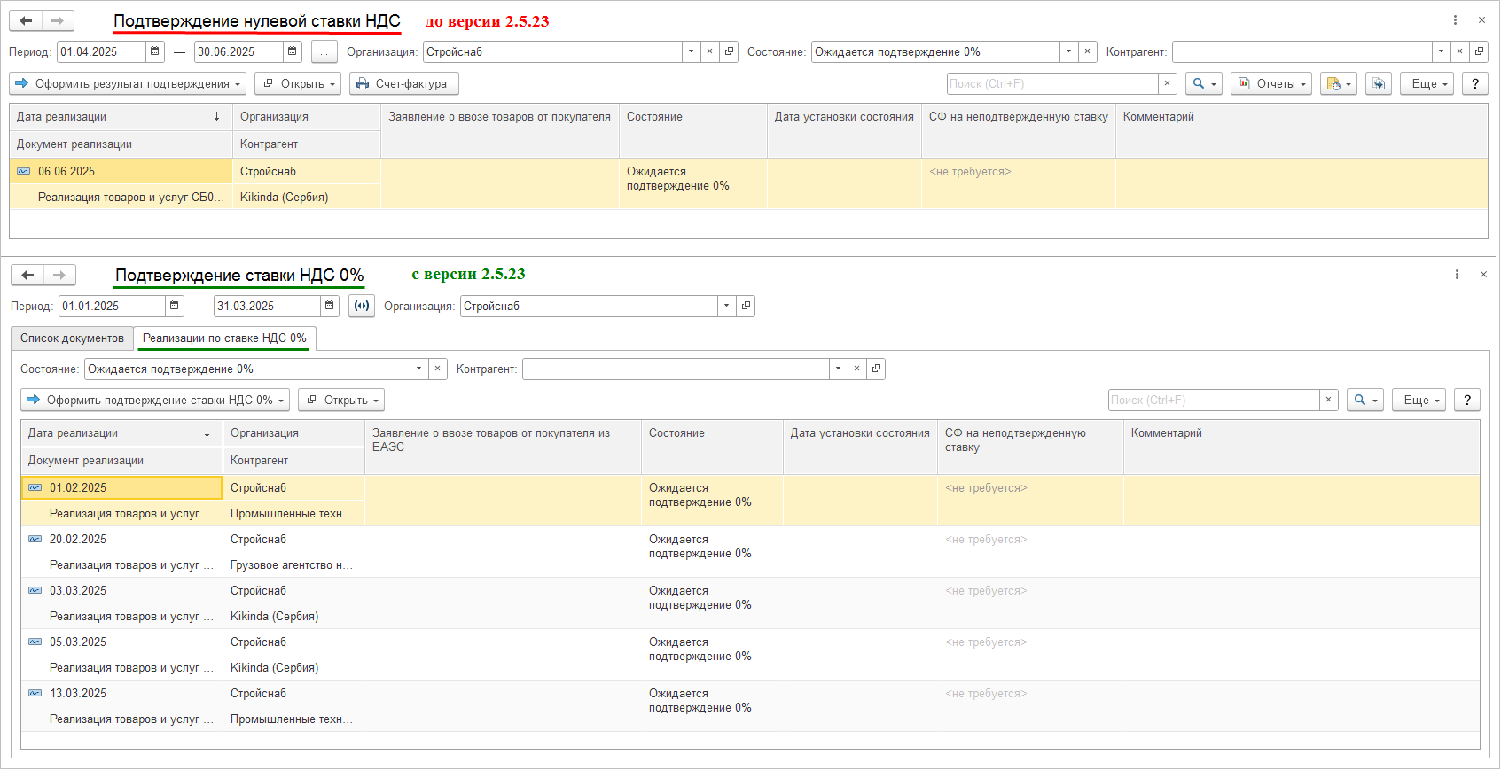 По гиперссылке Оформить подтверждение ставки НДС 0% выполняется переход к рабочему месту Подтверждение ставки НДС 0% (до версии 2.5.23 рабочее место называлось Подтверждение нулевой ставки НДС). В рабочее место по подтверждению ставки внесены изменения. Список реализаций, по которым требуется подтверждение ставки, вынесен на закладку Реализации по ставке НДС 0%. Добавлена закладка Список документов, на которой отображается список оформленных новых документов Подтверждение ставки НДС 0%.