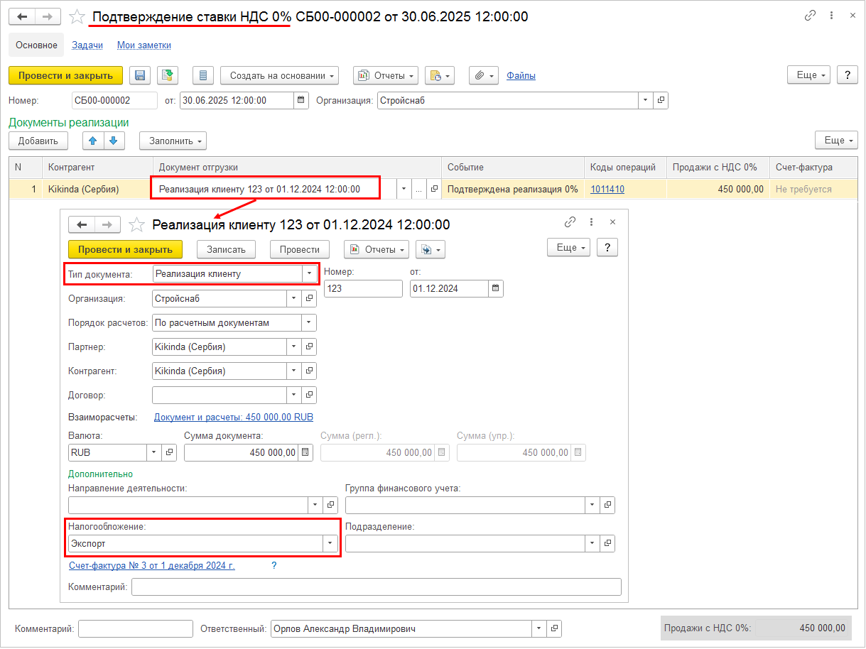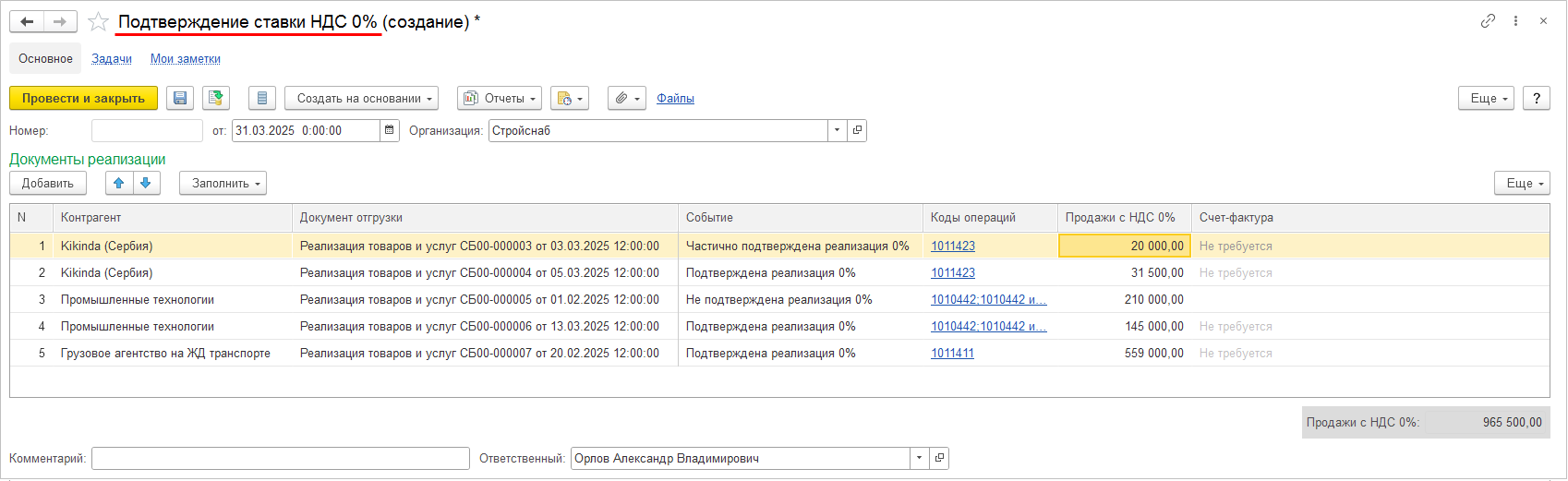При записи документа Подтверждение ставки НДС 0% по строкам, в которых Событие определено как Не подтверждена реализация 0%, для начисления НДС формируются документы Счет-фактура на неподтвержденную реализацию по ставке 0%.