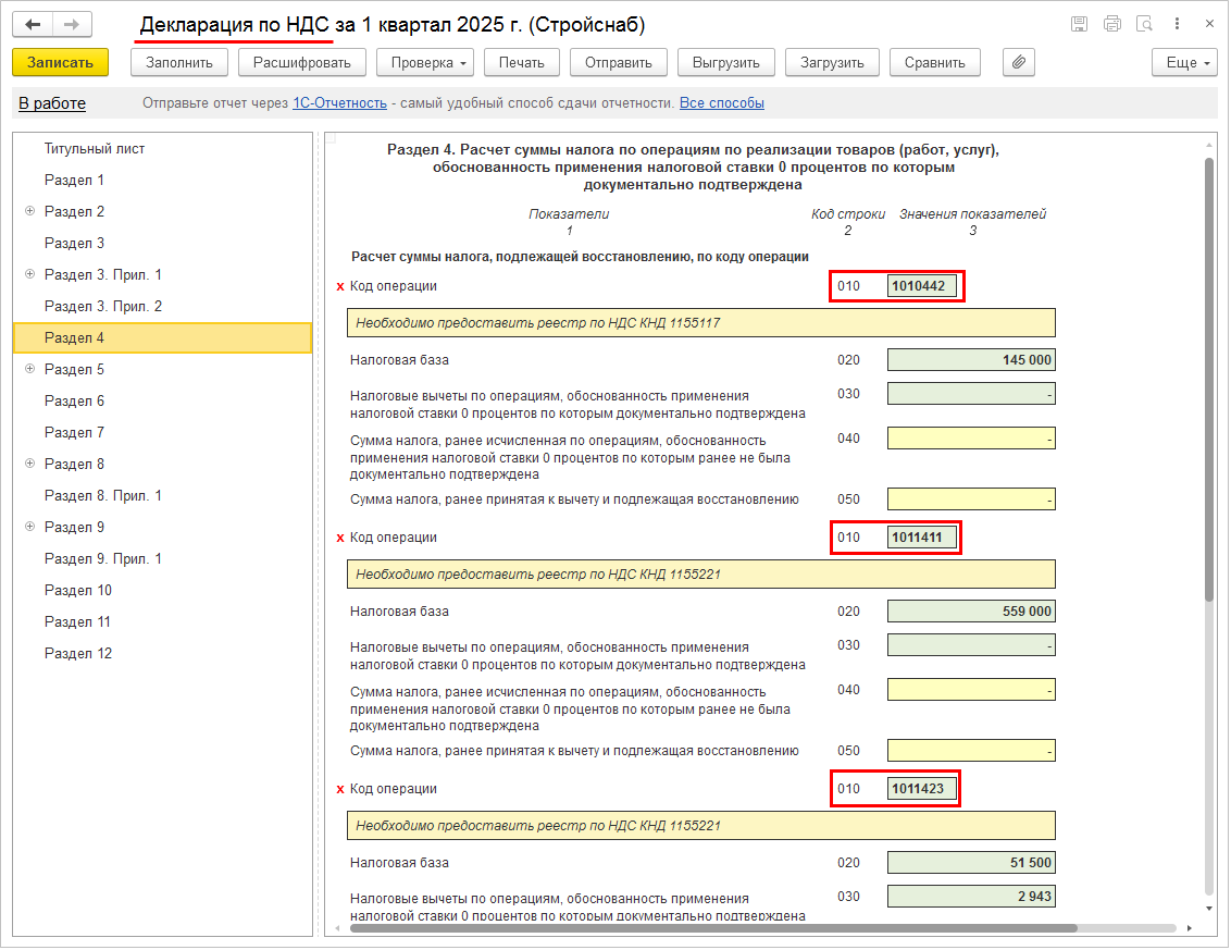 С версии 2.5.23 в разделах 4, 5 и 6 декларации по НДС налоговая база и налоговые вычеты заполняются в разрезе кодов операций.