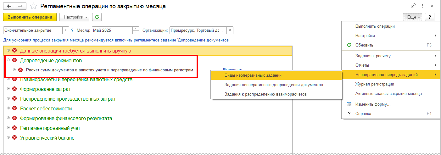 Также администратор может включить выполнение и настроить расписание регламентного задания Допроведение документов для запуска выполнения заданий из очереди (по умолчанию с 21.00 до 06.00). В форме Регламентные операции по закрытию месяца, если не включено задание Допроведение документов, выводится соответствующее напоминание в виде ссылки.