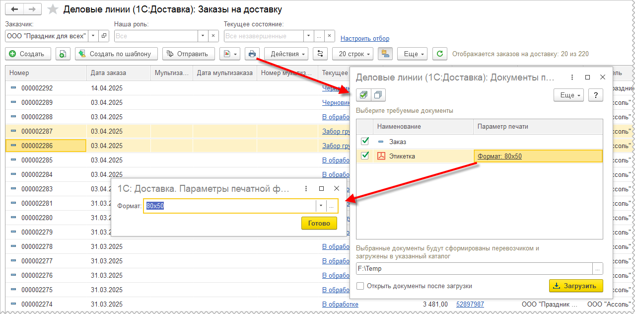 При печати этикеток из списка Деловые линии (1С:Доставка): Заказы на доставку предусмотрен параметр печати – формат (размер в пикселях по горизонтали и вертикали).