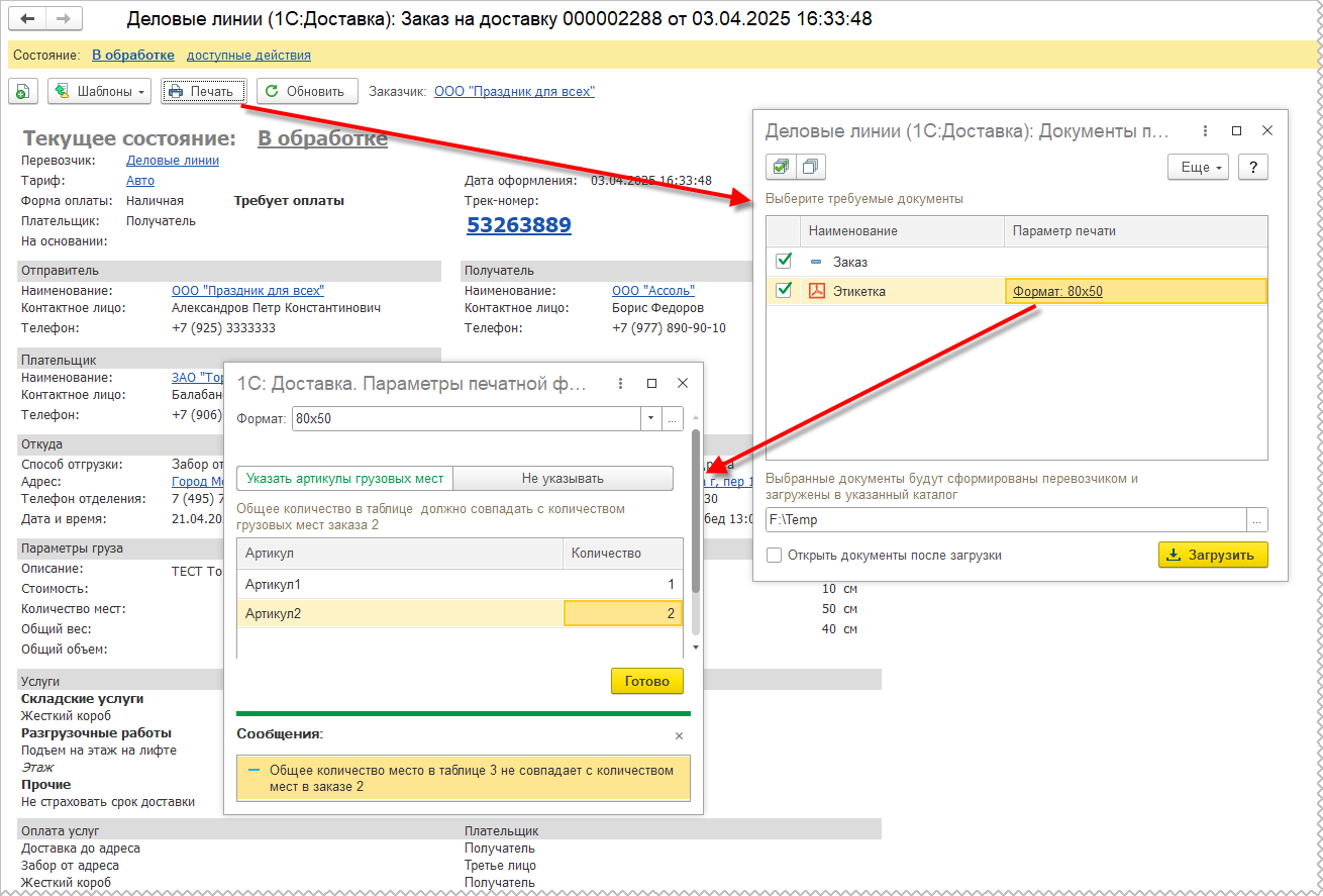 При вызове команды печати из формы заказа, если этикетка для заказа ранее не формировалась, в параметрах печати можно указать формат и наименования артикулов грузовых мест. Контролируется общее количество грузомест, охватываемых артикулами.