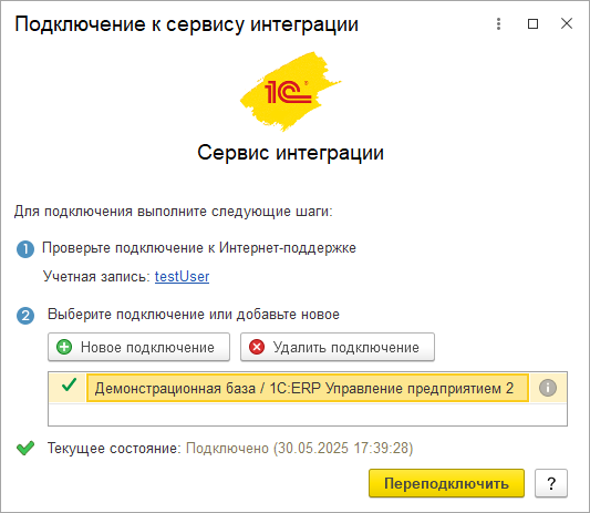 Далее в форме настроек НСИ и администрирование – Настройки интеграции – Интеграция с маркетплейсами по ссылке Настройки подключения необходимо выполнить подключение учетной записи сервиса интеграции и торговой площадке Wildberries. Прежде всего, проверяется подключение к сервису интеграции. Если подключение к сервису интеграции не настроено, то отображается форма Подключение к сервису интеграции, в которой нужно выполнить или проверить подключение к интернет-поддержке пользователей 1С, выбрать или создать новое подключение.