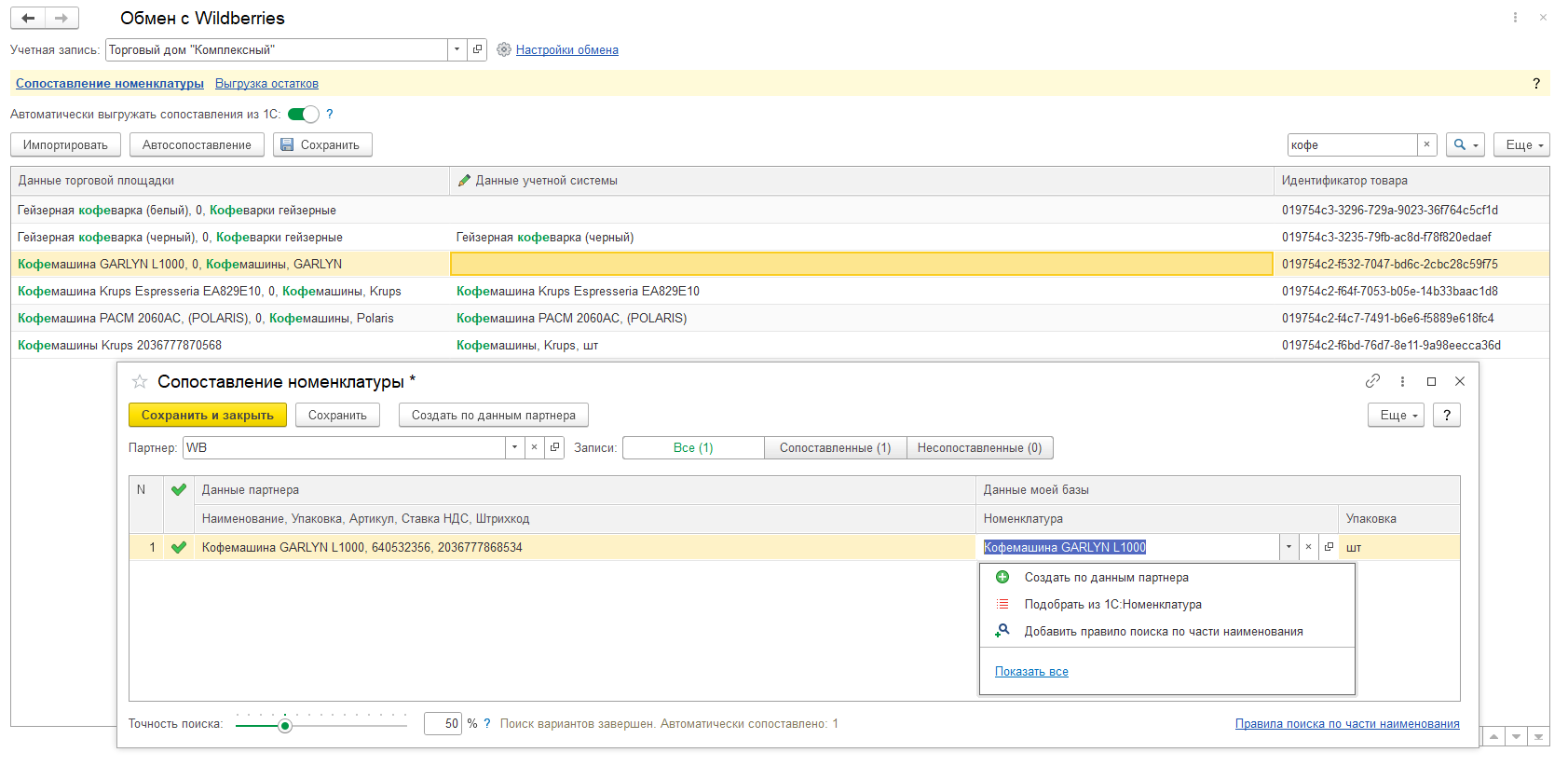 Имеется возможность автоматического сопоставления номенклатуры (команда Автосопоставление). Поиск производится по артикулу и наименованию.