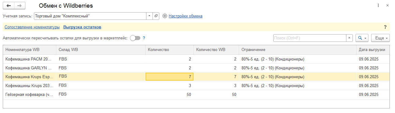 В списке отображается текущий остаток по складу торговой площадки по данным информационной базы (Количество) и торговой площадки (Количество WB) соответственно. Также показывается, какое ограничение было применено к выгружаемому количеству.