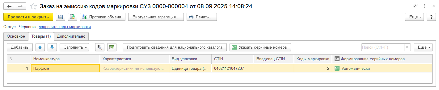 В документе Заказе на эмиссию кодов маркировки ИС МП
