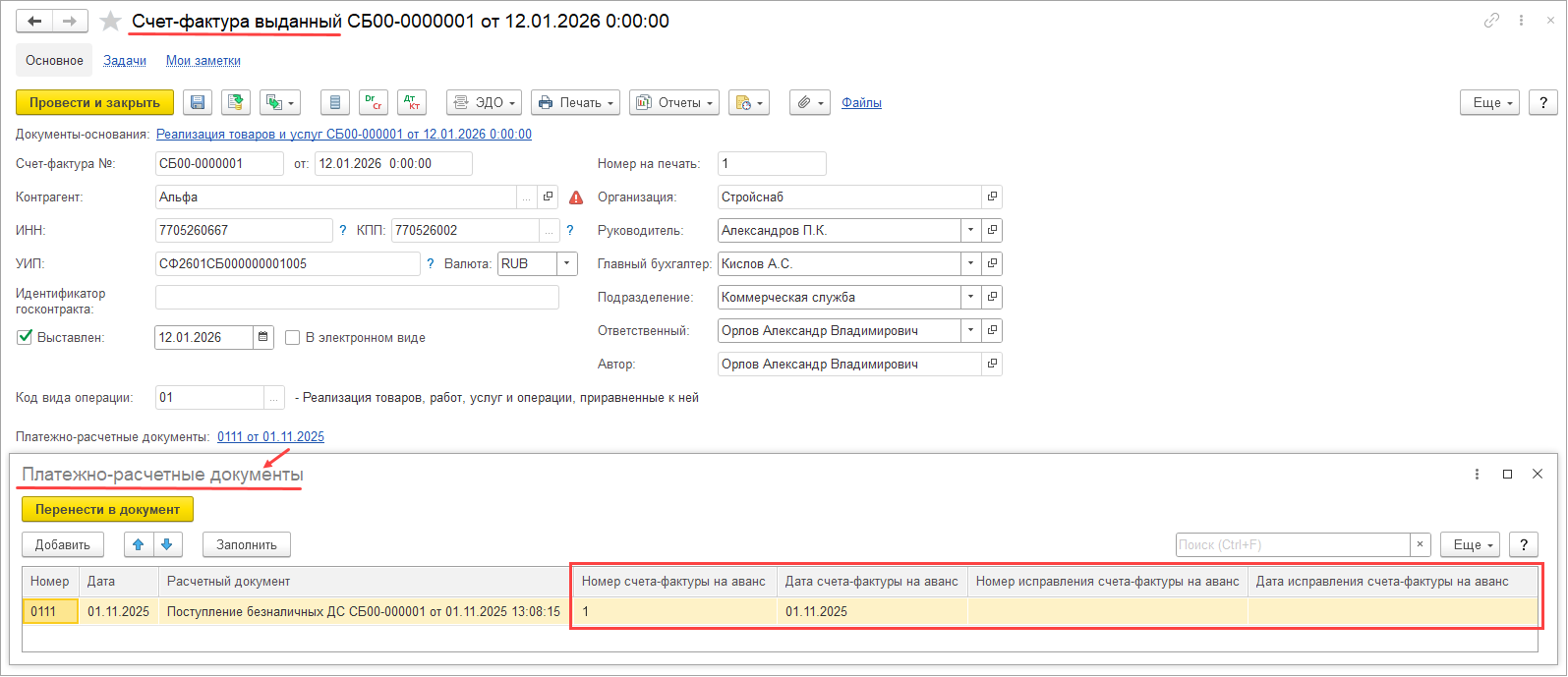 В документах Счет-фактура выданный и Счет-фактура выданный комиссионеру (агенту) на форму Платежно-расчетные документы добавлены новые колонки табличной части: Расчетный документ (документ поступления аванса), Номер счета-фактуры на аванс, Дата счета-фактуры на аванс, Номер исправления счета-фактуры на аванс, Дата исправления счета-фактуры на аванс. Новые реквизиты отображаются в счетах-фактурах с 01.01.2026 г.
