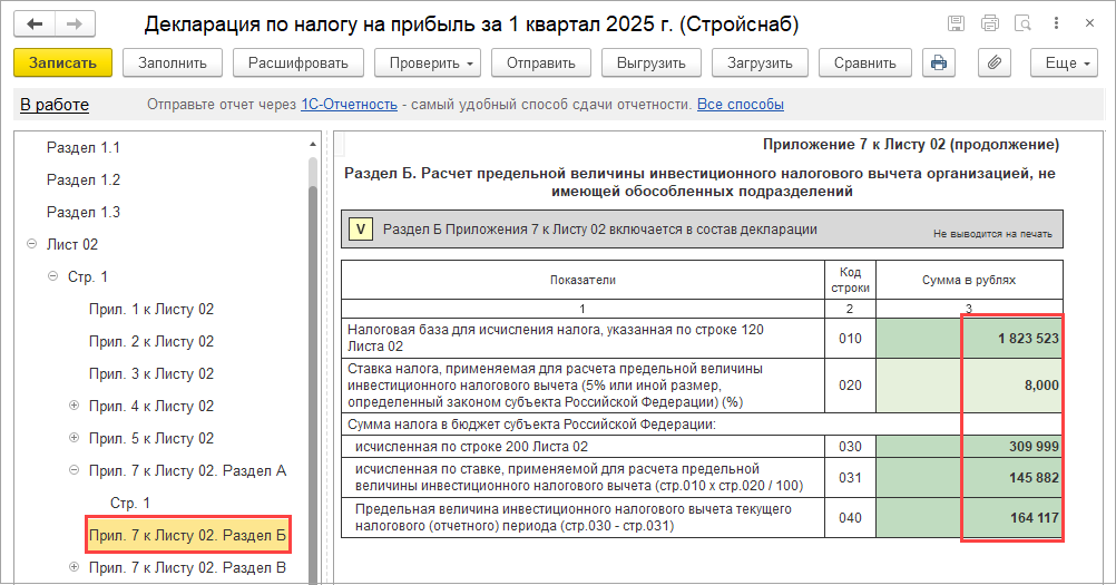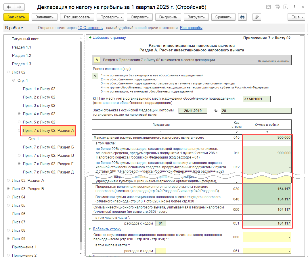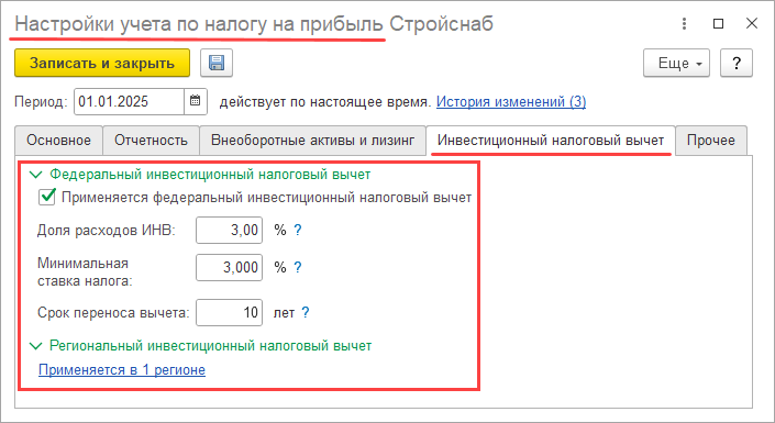 Разработана функциональность, позволяющая учитывать при расчете налога на прибыль применение организацией федерального и/или регионального инвестиционного вычета в соответствии со ст. 286.1, ст. 286.2 НК РФ и Постановлением Правительства РФ 1638 от 28.11.2024 «О параметрах применения федерального инвестиционного налогового вычета».
