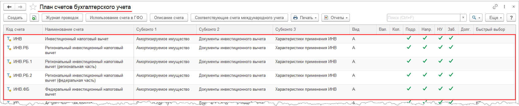 Для отражения операций по применению инвестиционных вычетов в план счетов добавлен забалансовый счет ИНВ «Инвестиционный налоговый вычет» и субсчета к нему. На субсчетах организован учет РИНВ (счет ИНВ.РБ «Региональный инвестиционный налоговый вычет») с разделением на региональную и федеральную часть (субсчета ИНВ.РБ.1 «Региональный инвестиционный налоговый вычет (региональная часть)» и ИНВ.РБ.2 «Региональный инвестиционный налоговый вычет (федеральная часть)» соответственно) и ФИНВ (счет ИНВ.ФБ «Федеральный инвестиционный налоговый вычет»).