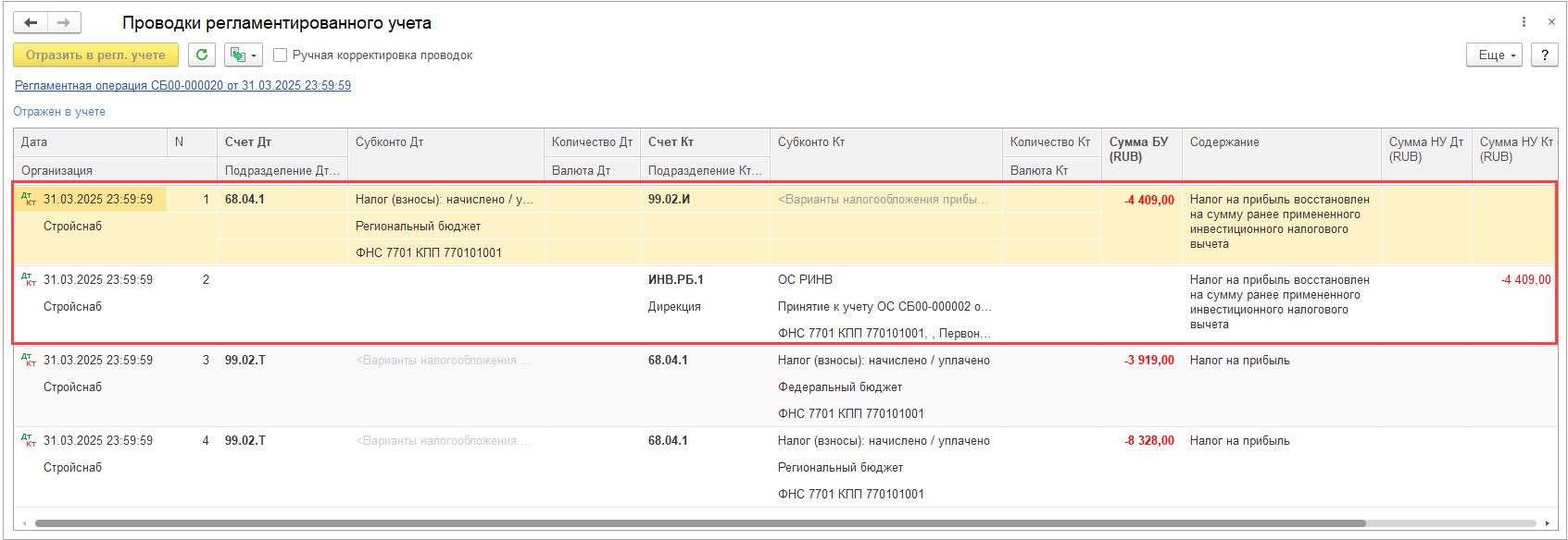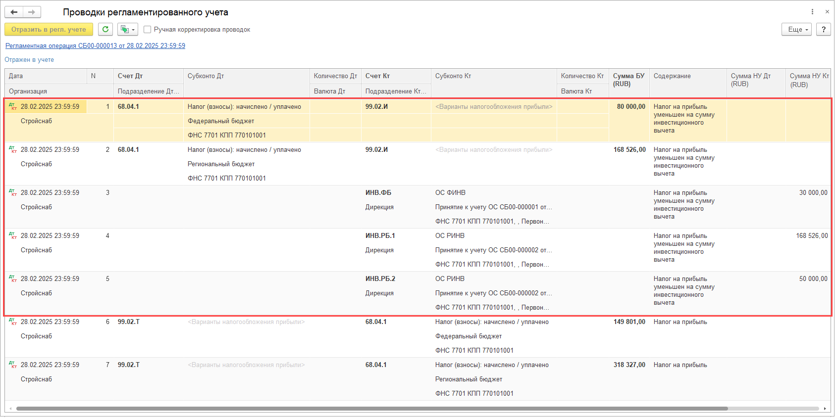 При выполнении регламентной операции Формирование финансового результата - Расчет отложенного налога по ПБУ 18 процедуры Закрытие месяца рассчитывается ОНА и формируются проводки Дт 09 (по новым видам активов/обязательств «Федеральный инвестиционный вычет» и «Региональный инвестиционный вычет») в корреспонденции с новым счетом 99.02.И «Инвестиционный вычет по налогу на прибыль» (счет имеет субконто «Варианты налогообложения прибыли», которое заполняется, если организация ведет раздельный учет по налогу на прибыль).