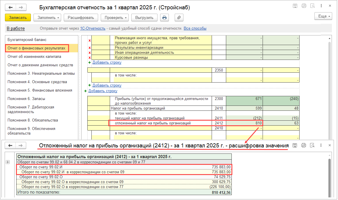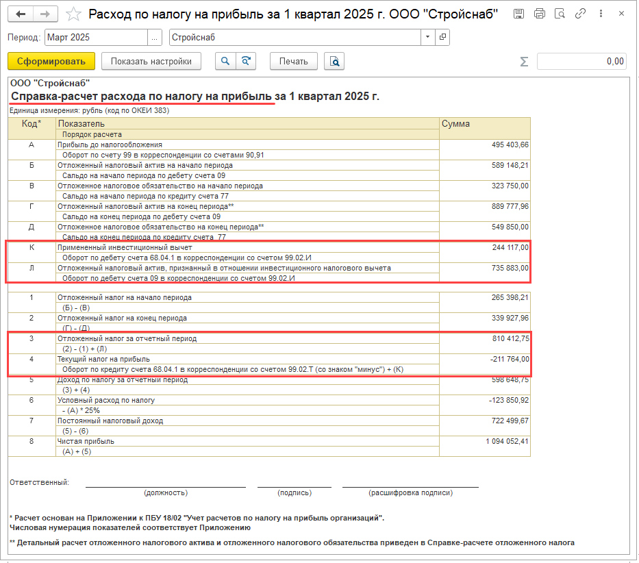 Инвестиционный налоговый вычет, перенесенный на следующие налоговые периоды, (оборот по счету 99.02.И в корреспонденции со счетом 09) учитывается при заполнении строки 2412 «отложенный налог на прибыль организаций» отчета о финансовых результатах в составе бухгалтерской отчетности.
