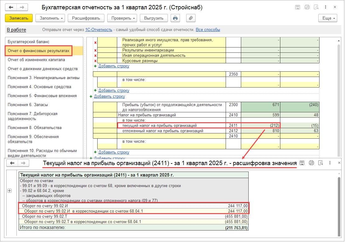 Влияние ФИНВ и РИНВ на текущий и отложенный налог на прибыль можно увидеть в отчете Справка-расчет расхода по налогу на прибыль (меню Регламентированный учет – Бухгалтерский и налоговый учет – Справки-расчеты).