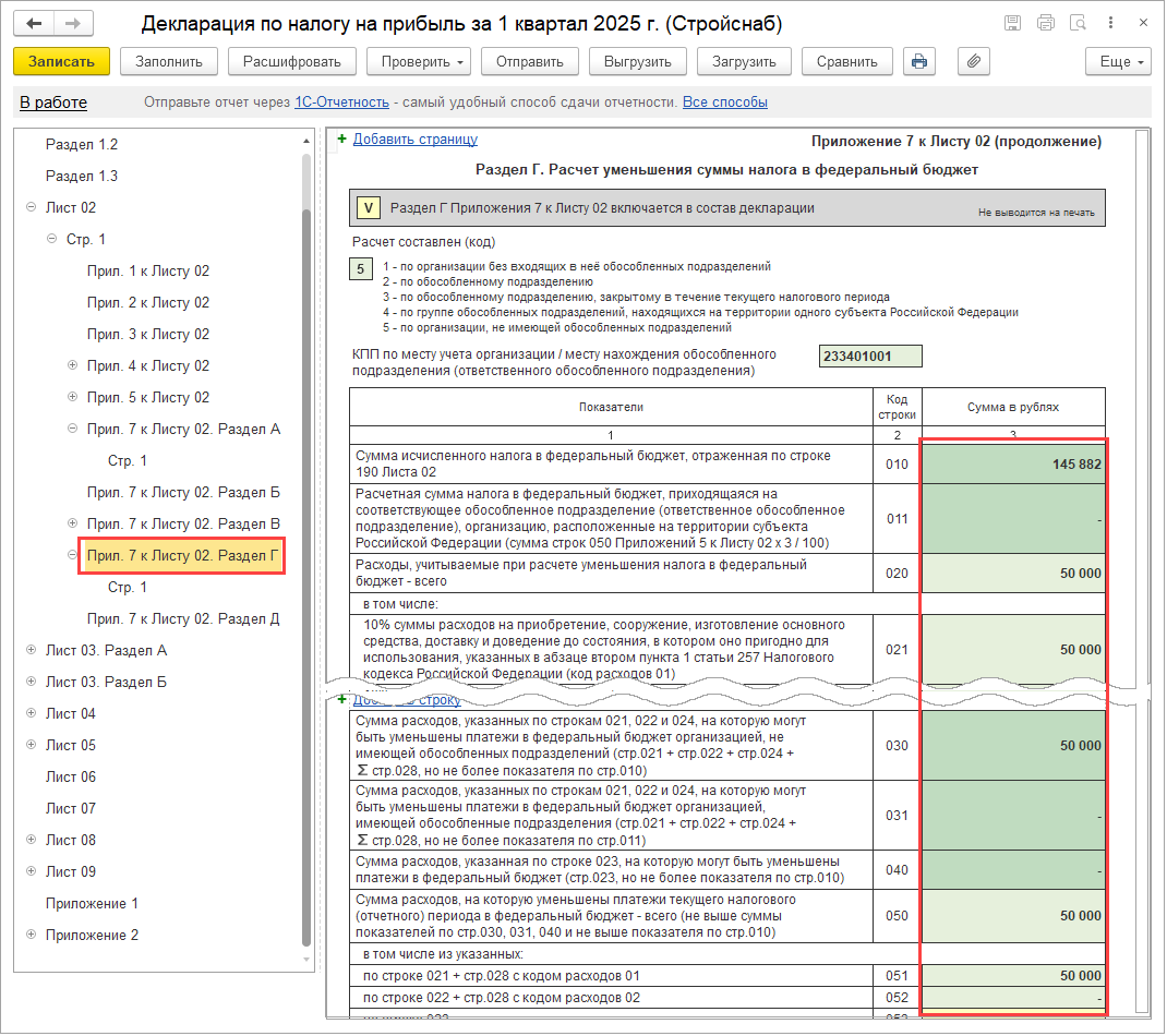 Расчет уменьшения суммы налога в федеральный бюджет на РИНВ отражается в Разделе Г Прил. 7 к Листу 02