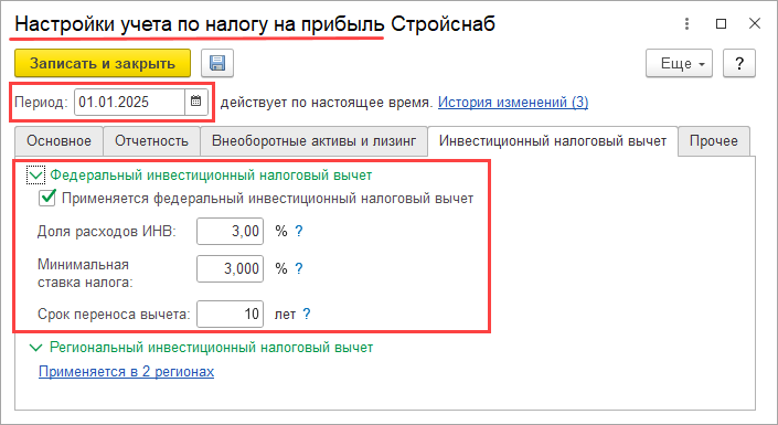 Поддержана возможность скорректировать налоговую базу по налогу на прибыль, посчитать налог и сформировать отчет о финансовых результатах за 2025 год с учетом применения федерального инвестиционного налогового вычета (далее - ФИНВ) к основным средствам, принятым к учету до перехода на версию, в которой была реализована функциональность по применению ФИНВ, без корректировок регистров и открытия периода для изменения.
