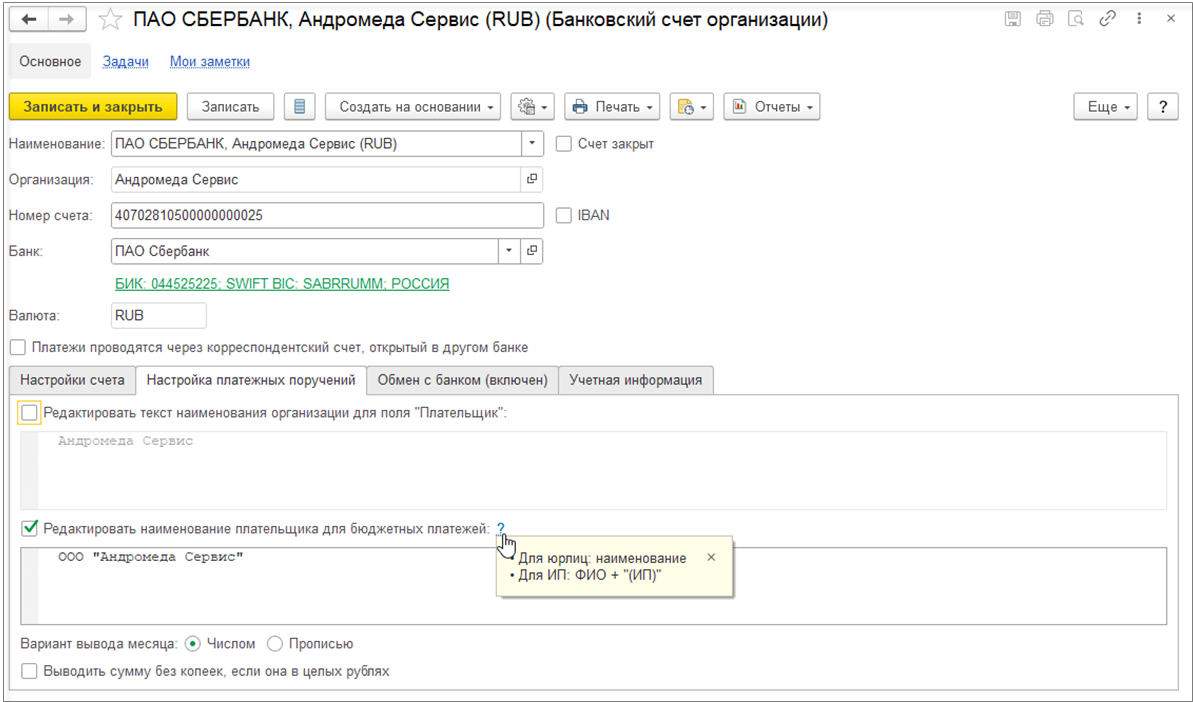выполняться подбор наименования плательщика из нового реквизита в справочнике Банковские счета организаций. Поскольку для способа
