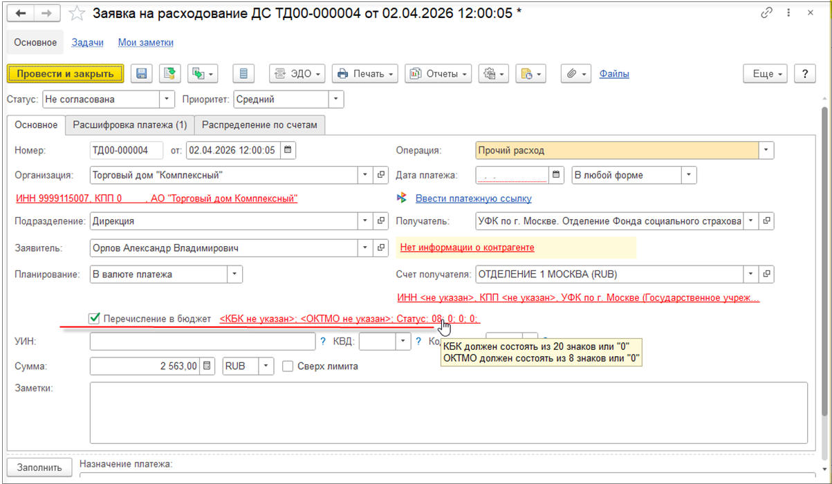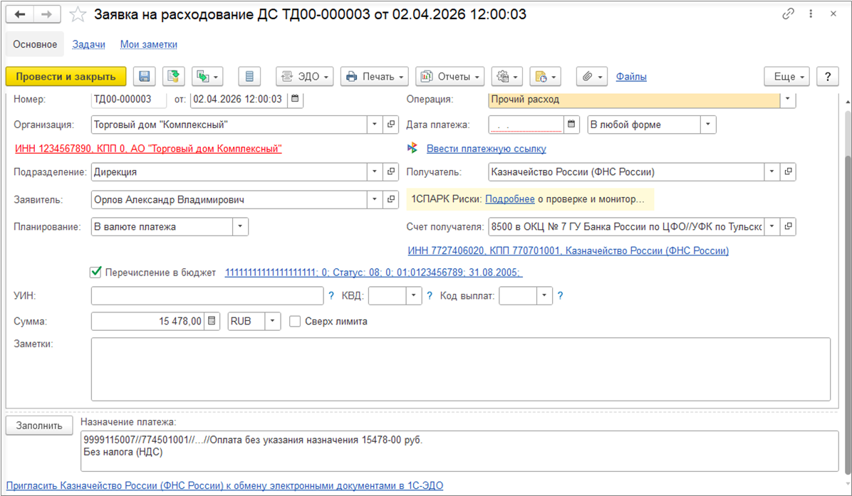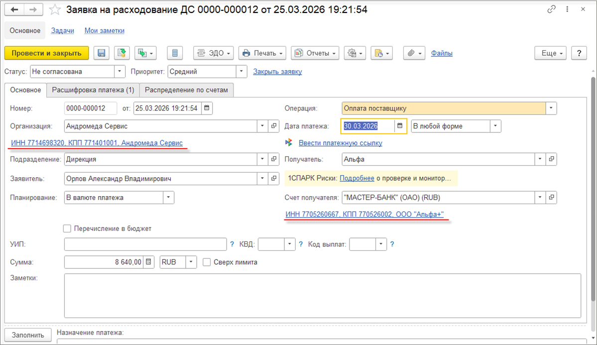 Особенности заполнения реквизитов плательщика в документах Заявка на расходование ДС