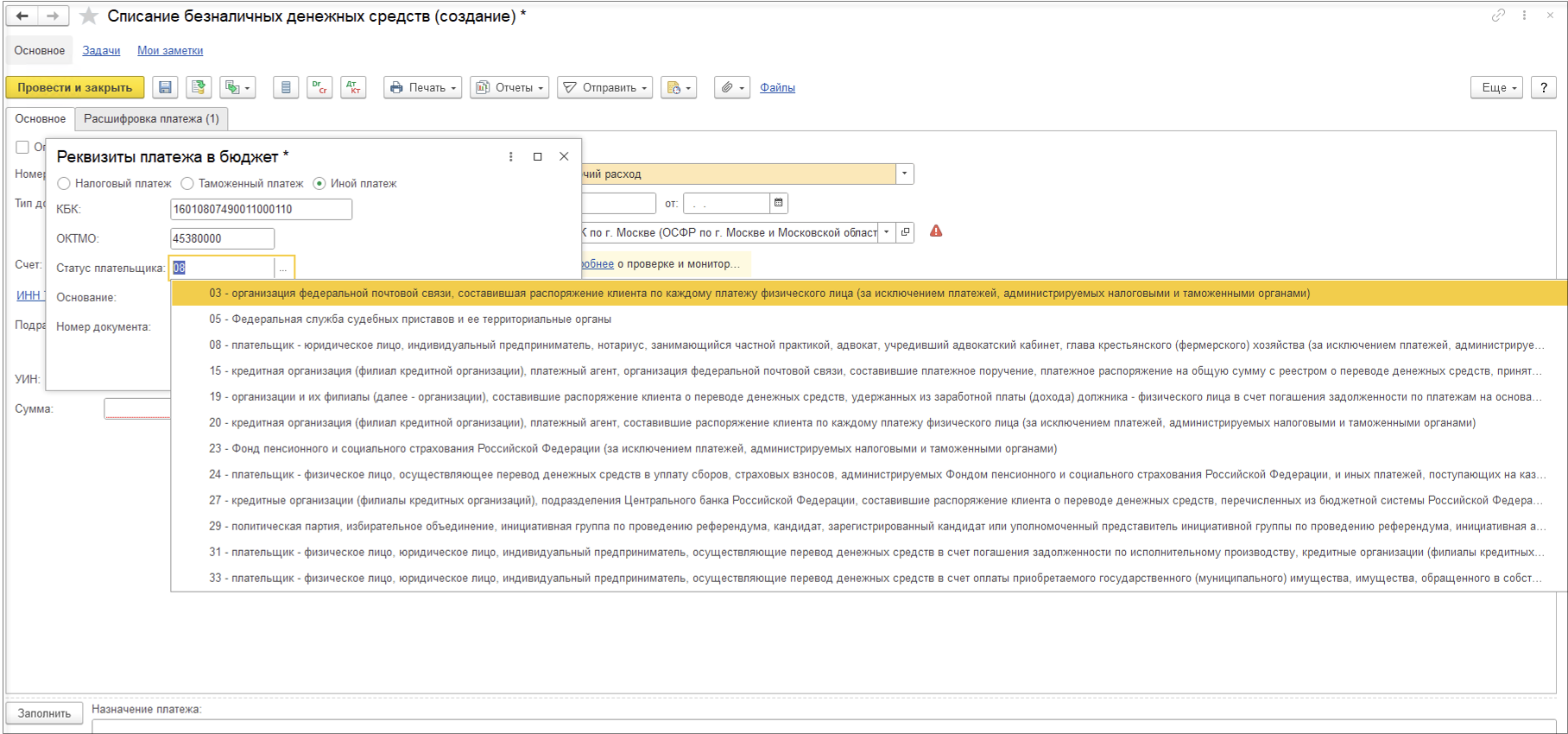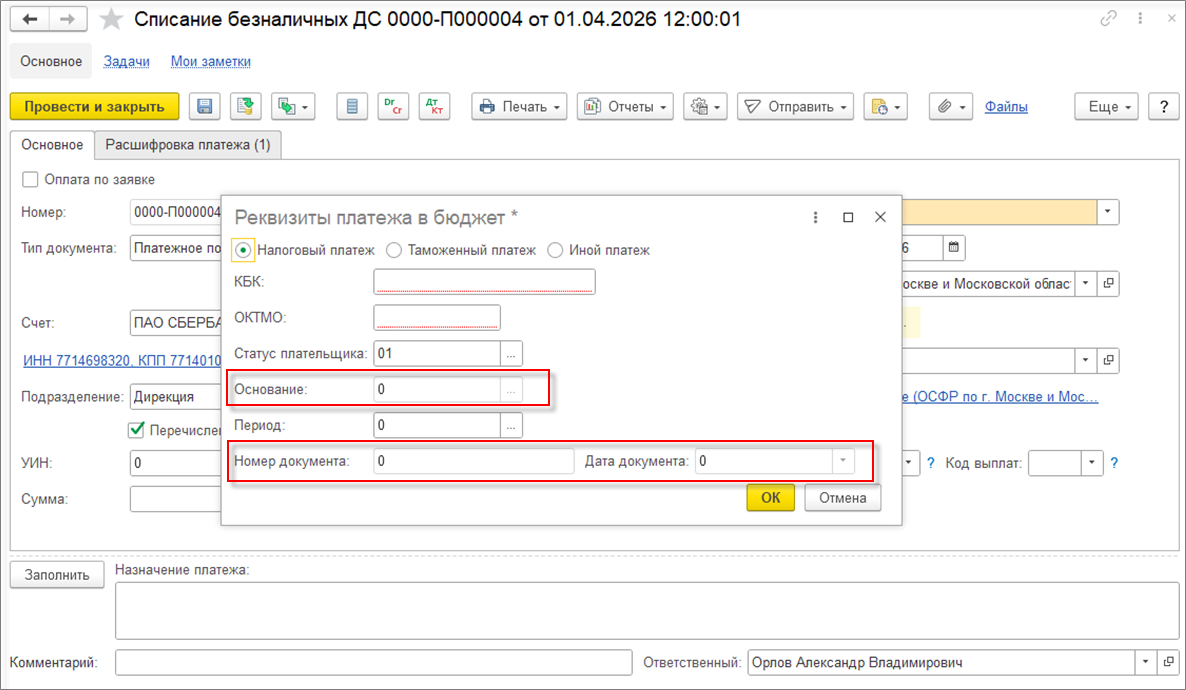заполняются автоматически и не доступны для редактирования. КБК может заполняться по последнему аналогичному платежу;