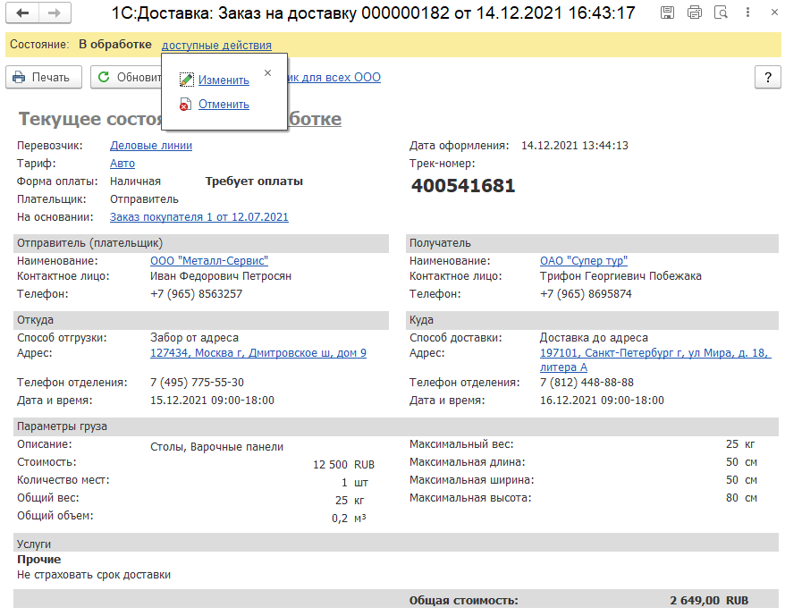 Внести изменения можно в карточке оформленного (состояние В обработке) заказа на доставку. Если перевозчик позволяет редактировать заказ, то на форме отображается ссылка Изменить заказ в группе Доступные действия.