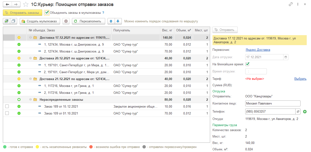 Перевозчики позволяют объединять несколько заказов на доставку с одним адресом отгрузки в одну заявку. В интерфейсе программы и далее в документации такую заявку будем называть мультизаказом. В практике делового оборота такие могут использоваться другие названия: партия, отправление, рейс, маршрутное задание, рейсовое задание, заявка с мультиточками, набор.