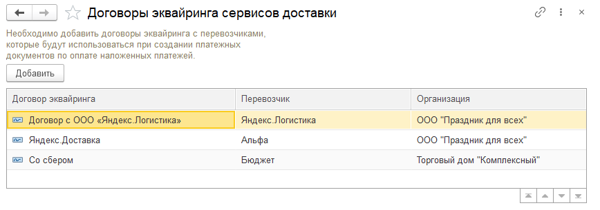 Возможность получения оплаты наложенным платежом включается функциональной опцией Использовать наложенные платежи в форме НСИ и администрирование – Настройка интеграции – 1С:Бизнес-сеть. Для создания и заполнения документов также требуется по ссылке Настроить создание платежных документов в форме НСИ и администрирование – Настройка интеграции – 1С:Бизнес-сеть указать контрагента, соответствующего перевозчику, а также договор экваринга с ним. Именно этот договор будет заполняться при автоматическом создании платежных документов от этого перевозчика. Настройки выполняет администратор.