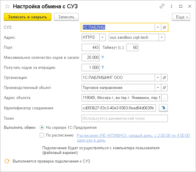 По ссылке Параметры подключения к СУЗ следует указать параметры СУЗ: OMS ID, адрес и порт, идентификатор соединения, которые можно посмотреть в личном кабинете (см. https://markirovka.crpt.ru) в разделе «Станции управления заказами». Также необходимо указать Производственный объект это подразделение организации и его адрес.