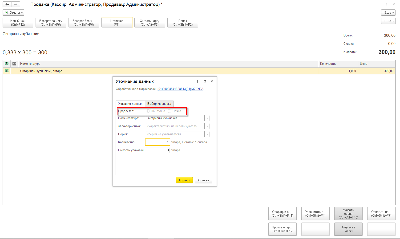 При добавлении в чек кода маркировки товара, для которого предусмотрено частичное выбытие, отображается форма уточнения данных. В этой форме можно выбрать вариант продажи. Для сигар это будут варианты: Поштучно и Пачка.