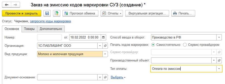 Маркировку продукции выполняет производитель или импортер продукции. Коды маркировки должны быть предварительно заказаны документом Заказ кодов маркировки СУЗ в рабочем месте Обмен с ИС МП. Документ можно создать вручную или оформить автоматически по Заказу на производство. В заказе указывается способ ввода в оборот: Производство в РФ или Импорт в РФ. Печать кодов маркировки может производиться самостоятельно или с привлечением третьего лица - сервис-провайдера. В частности, сервис-провайдером может быть Центр этикетирования и маркировки (ЦЭМ) - это специализированная типография, которая печатает этикетки на продукцию с кодами маркировки.