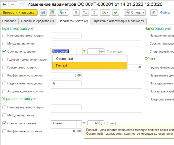 На форму документа Изменение параметров ОС выведены новые реквизиты и кнопка с подсказкой к ним. Добавлен переключатель в БУ и УУ для выбора варианта срока использования. Если выбран вариант Полный, то изменений в поведении системы не будет. Если выбран вариант Остаточный, то рассчитывается разница в месяцах между датой ввода в эксплуатацию и датой документа, и к этой разнице прибавляется указанное пользователем количество месяцев остаточного СПИ, затем результат записывается в регистр.