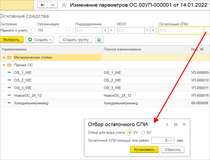 В форму подбора ОС добавлен отбор по остаточному сроку полезного использования. При нажатии на кнопку выбора открывается дополнительное окно с настройкой отбора по виду учета (УУ или БУ) и целым количеством месяцев.