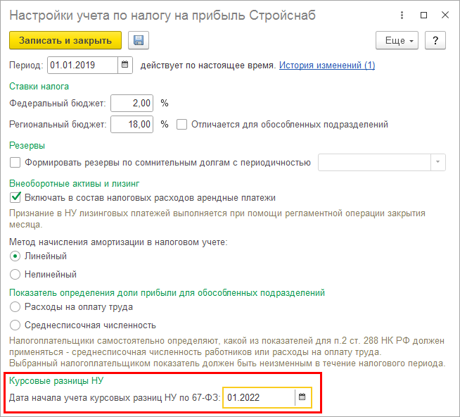 Порядок учета курсовых разниц, определенный Законом 67-ФЗ, вступил в силу с 01.01.2022г. Может быть ситуация, что первые месяцы 2022 года в организации уже закрыты для изменений. Поэтому для определения месяца, с которого организация начинает отражать в налоговом учете курсовые разницы в соответствии с 67-ФЗ, в блок Настройки учета по налогу на прибыль учетной политики добавлена опция Дата начала учета курсовых разниц НУ по 67-ФЗ.