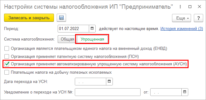 В блок Настройки системы налогообложения учетной политики организации добавлен признак Организация применяет автоматизированную упрощенную систему налогообложения (АУСН). Указанный признак доступен, если выбрана Упрощенная система налогообложения.