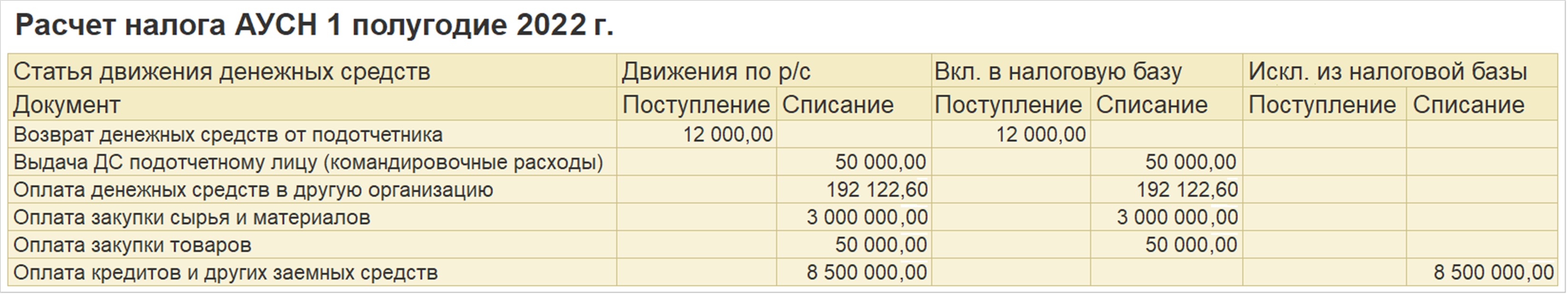 Разделение платежей в отчете Расчет налога АУСН на входящие и не входящие в налоговую базу при расчете налога в режиме АУСН выполняется на основании признака Не учитывается в налоговой базе АУСН в карточке элемента списка Статьи движения денежных средств.