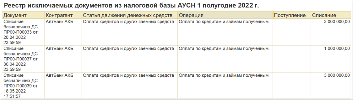 Отчет Реестр исключаемых документов АУСН позволяет проанализировать платежи, не включаемые в налоговую базу при расчете налога в режиме АУСН, в разрезе документов, статей движения денежных средств, контрагентов и типов операций.