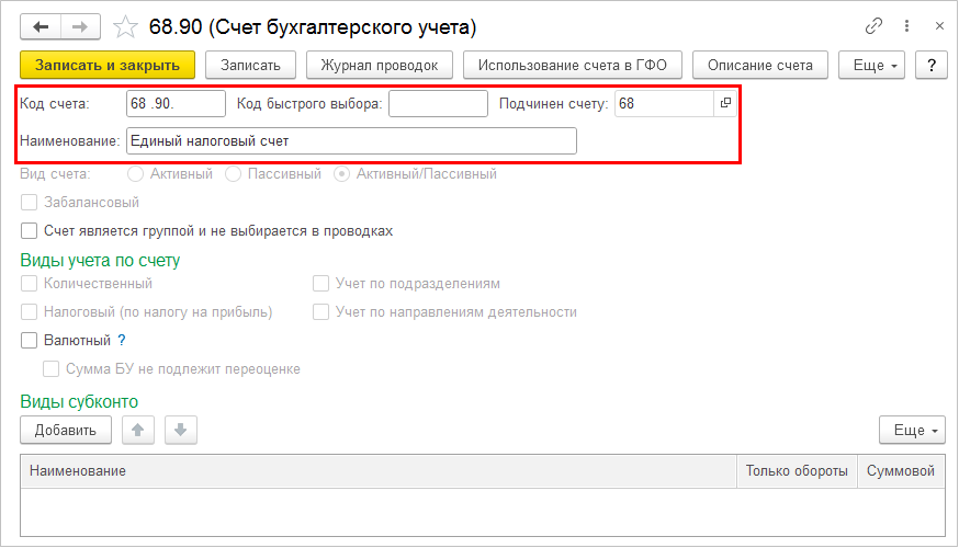 Для бухгалтерского учета расчетов с бюджетом по ЕНП в типовой план счетов добавлен счет 68.90 «Единый налоговый счет». Стандартными бухгалтерскими отчетами по счету 68.90 можно будет выполнять сверку состояния расчетов по ЕНП в информационной базе со сведениями в личном кабинете налогоплательщика.