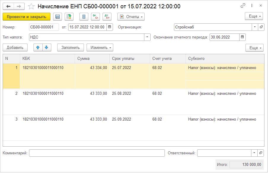 Документ Начисление ЕНП создается в разрезе организаций и типов налогов. В поле Тип налога к выбору предлагаются те налоги, по которым есть начисления (сальдо по кредиту субсчета 68.х или 69.х) на дату, указанную в поле Окончание отчетного периода.