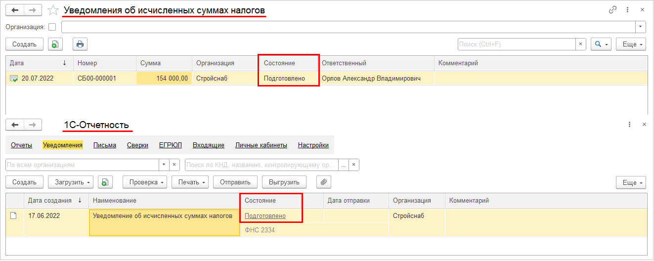 В списке документов Уведомление об исчисленных суммах налогов и в разделе Уведомления сервиса 1С-Отчетность отображается текущее состояние работы с уведомлением.