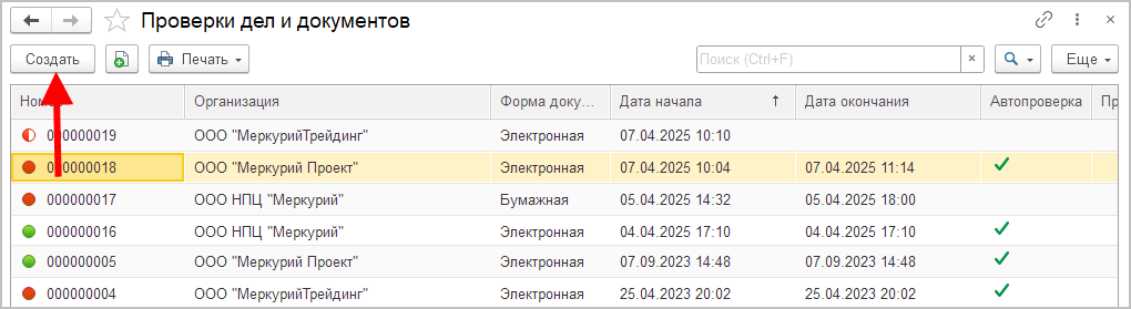 Проверка создается в разделе Архив документов – Проверки дел и документов по команде Создать.