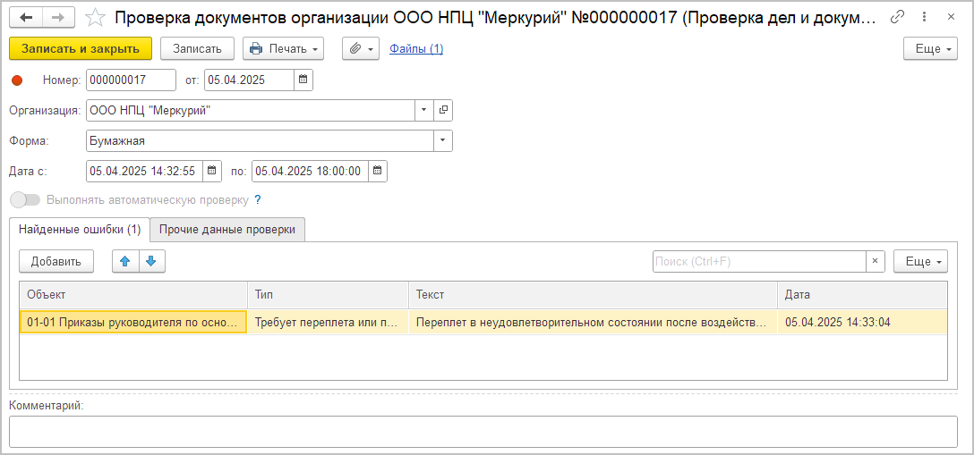До окончания проверки ее карточка будет недоступна для редактирования. После – в карточку вручную можно добавить сведения об ошибках.