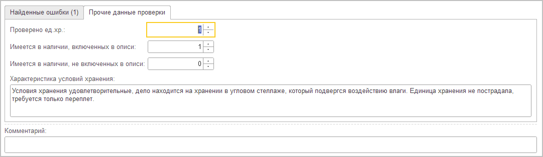 ■ Найденные ошибки – выбор по классификации «Правил организации хранения, комплектования, учета и использования архивных документов в организациях», принятых приказом Росархива № 77 от 31.07.2023). Например, «Требует реставрации», «Требует дезинфекции» и др.;