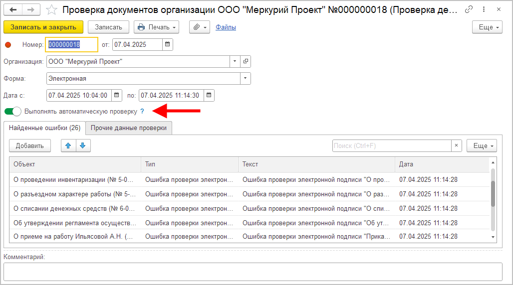 Для автоматической проверки электронных дел и документов в карточке проверки необходимо установить флаг Выполнить автоматическую проверку.