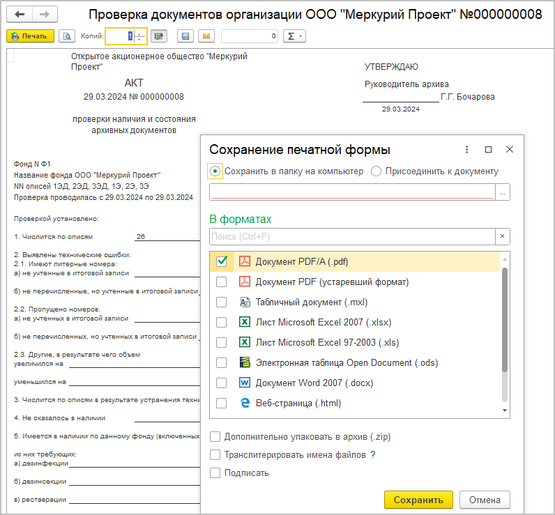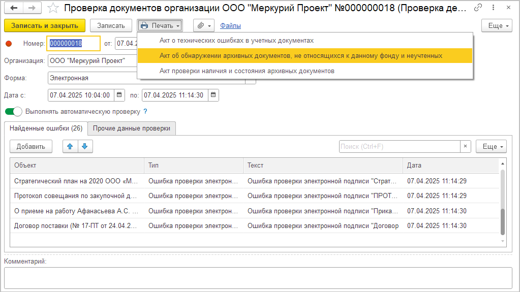 По результатам проверок можно вывести печатные формы, подготовленные согласно «Правилам организации хранения, комплектования, учета и использования архивных документов в организациях», принятых приказом Росархива № 77 от 31.07.2023).