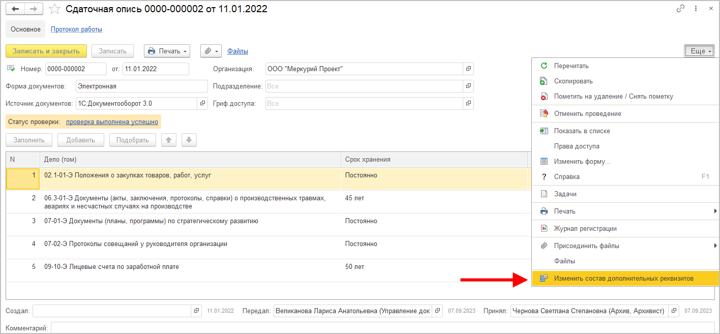 Для добавления / удаления дополнительных реквизитов в меню Еще карточки описи или акта предусмотрена команда Изменить состав дополнительных реквизитов.